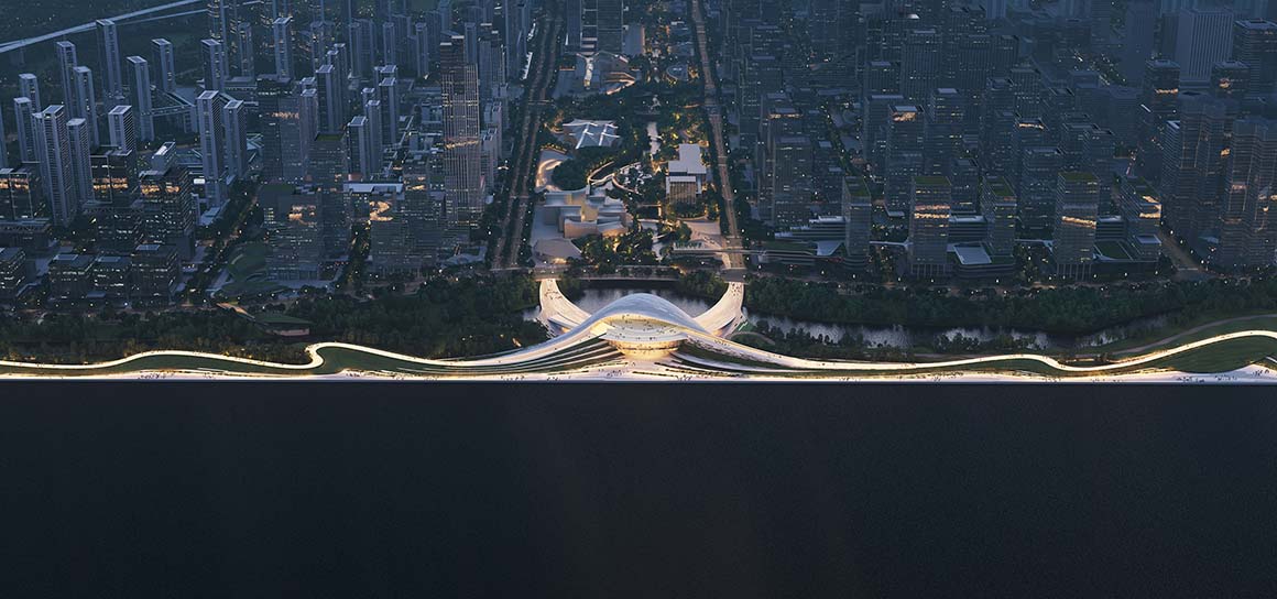 Project: Hangzhou Qiantang Bay Art Museum / Location: Hangzhou, China / Architect: Snøhetta / Collaborators: The Architectural Design & Research Institute of Zhejiang University Co., Ltd., Buro Happold / Client: Hangzhou Xiaoshan Qianjiang Century Development and Construction Co., Ltd. / Use: museum, gallery / Scope: architecture, landscape architecture, interior architecture / Gross floor area: 18,000m² / Competition: 2025 / Renderings: ©ATCHAIN (courtesy of the architect)