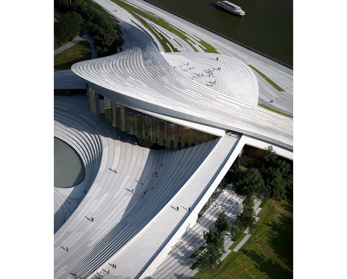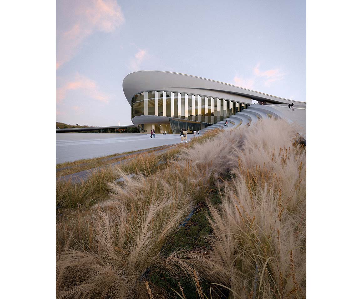 The 18,000 m² museum site is part of Hangzhou’s expanding downtown district along the Qiantang River. Situated at the junction of key waterfront axes and linked to the metro, the museum offers sweeping views that connect the river’s waterways with the city. Snøhetta uses the fluidity of these water systems as a creative catalyst, envisioning a continuous flow of art and imagination from the district’s cultural cluster toward the Qiantang River through a symbolic gateway. Inspired by the form and connective function of a bridge, the building consists of two undulating volumes. All circulation routes converge within the space between them, creating a dynamic public realm animated by movement. A tidal-like landscape leads visitors to the museum’s gateway and then upward to a rooftop terrace with panoramic river and city views.