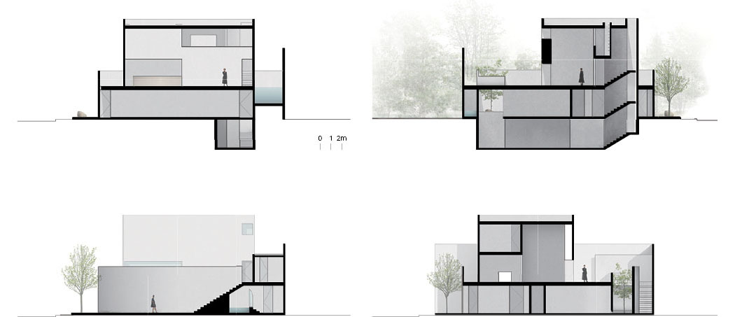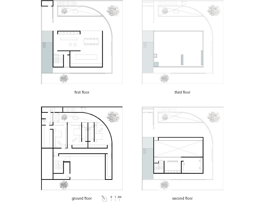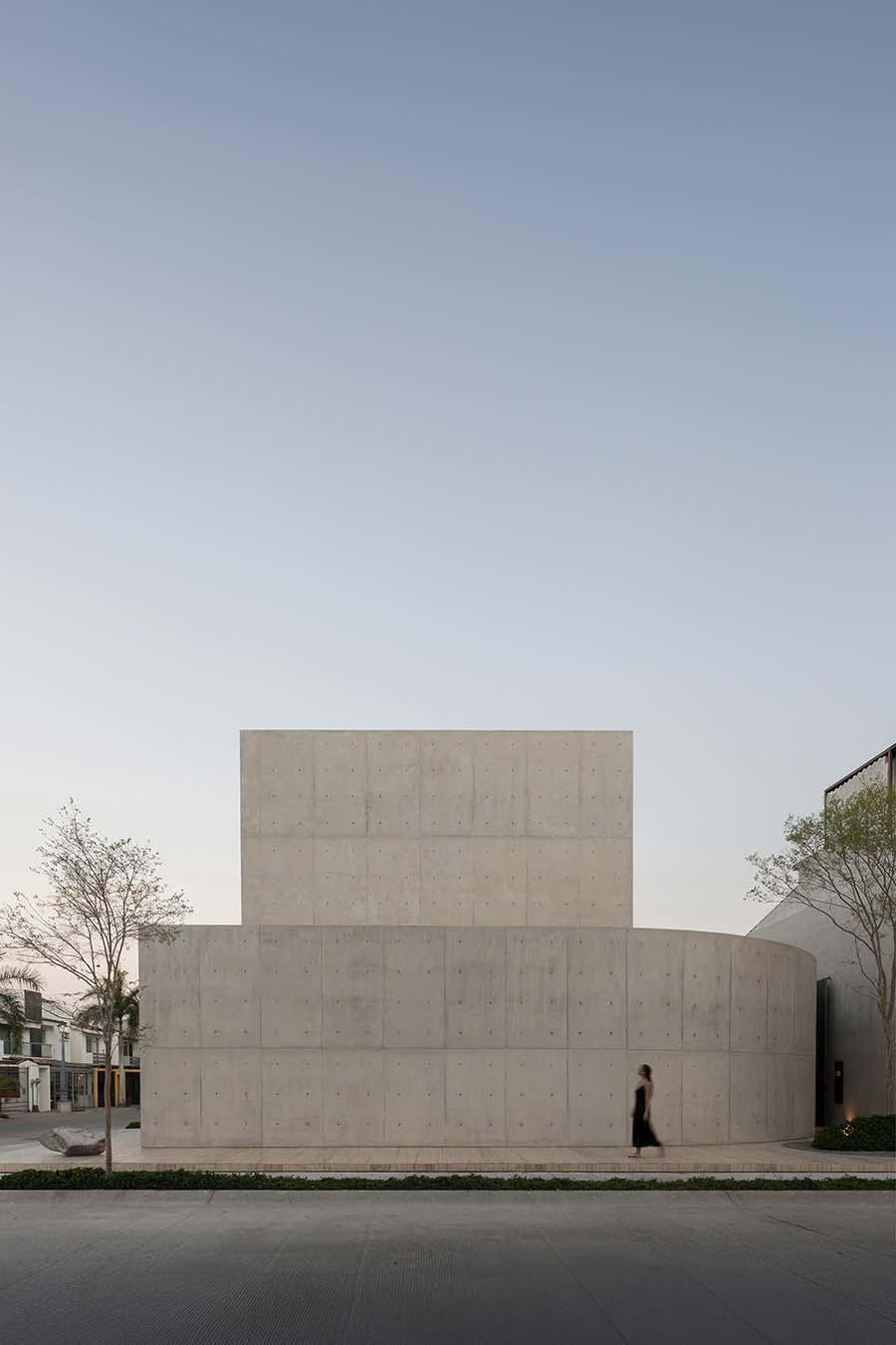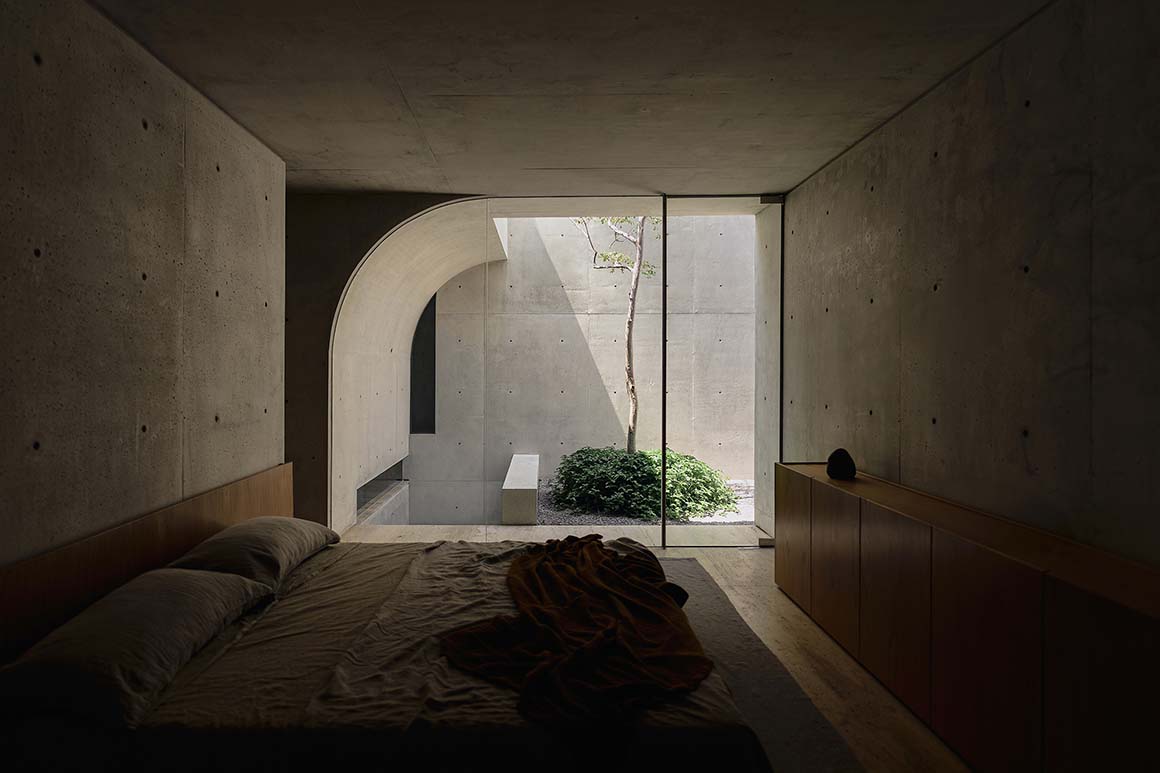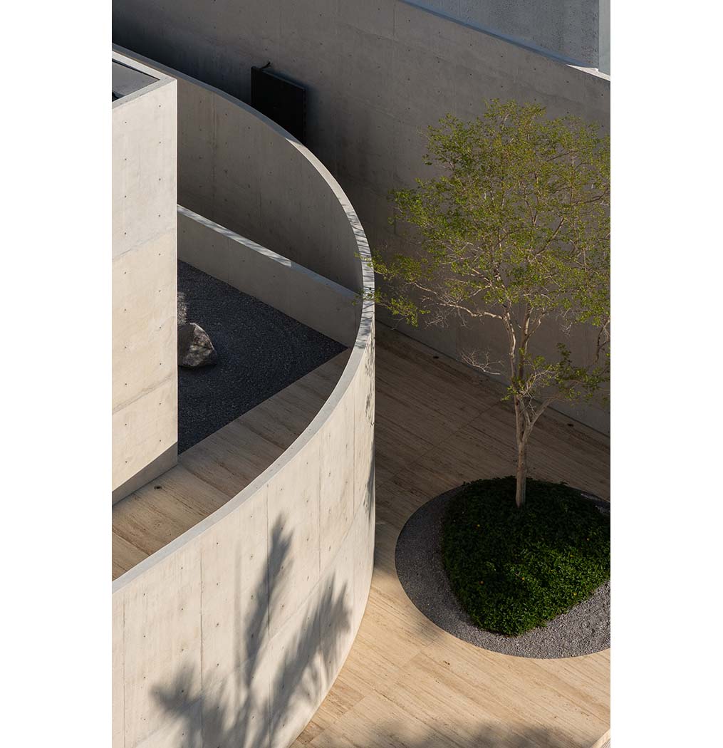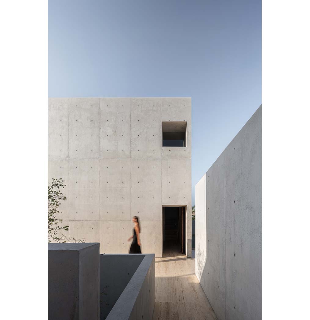In a neighborhood without remarkable views, the one place where the eye could rest was a small, tree-lined plaza. The house turns toward this source of breeze and shadow, yet avoids large glazed surfaces that would amplify heat. Instead, it adopts an oblique orientation, sensing the presence of the plaza rather than confronting it directly—as if watching quietly while letting the nearby sea breeze drift in.