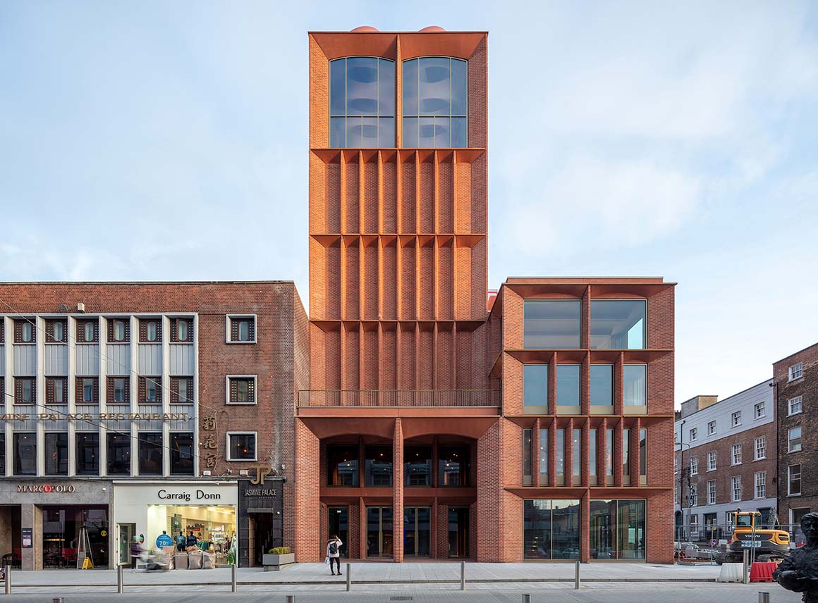 Since the 12th century, the Irish city of Limerick has evolved around its churches, with a skyline defined by spires and bell towers that shape its urban identity. Rising from a street corner in the heart of the city, the red-brick International Rugby Experience reflects this historic landscape. Conceived as a ‘Cathedral to Rugby,’ the seven-storey building stands on a compact urban site within the fine-grained fabric of the Georgian quarter. As its concept suggests, the design draws on the scale and proportion of civic architecture such as churches and public halls. These civic precedents—long embedded in the streetscape of Limerick—lend the project both historical resonance and a strong connection to the city‘s cultural and architectural heritage. At its core lies Munster Rugby, the provincial team that embodies the sporting spirit of the region.