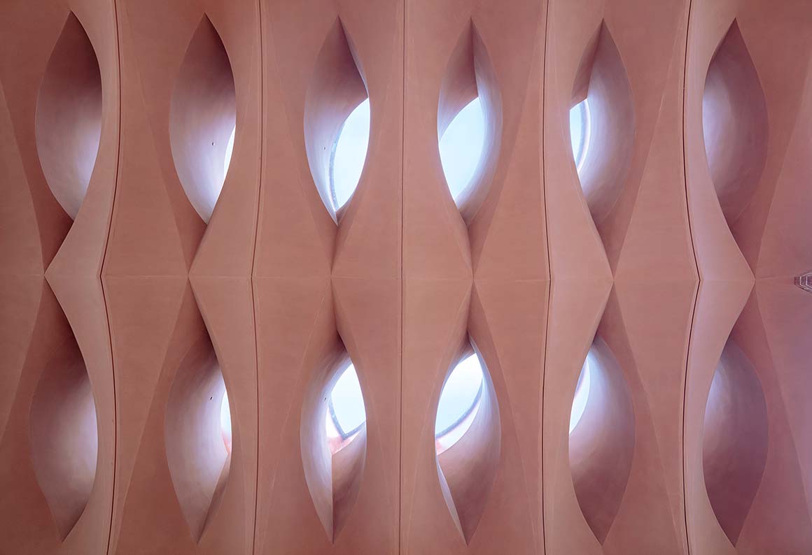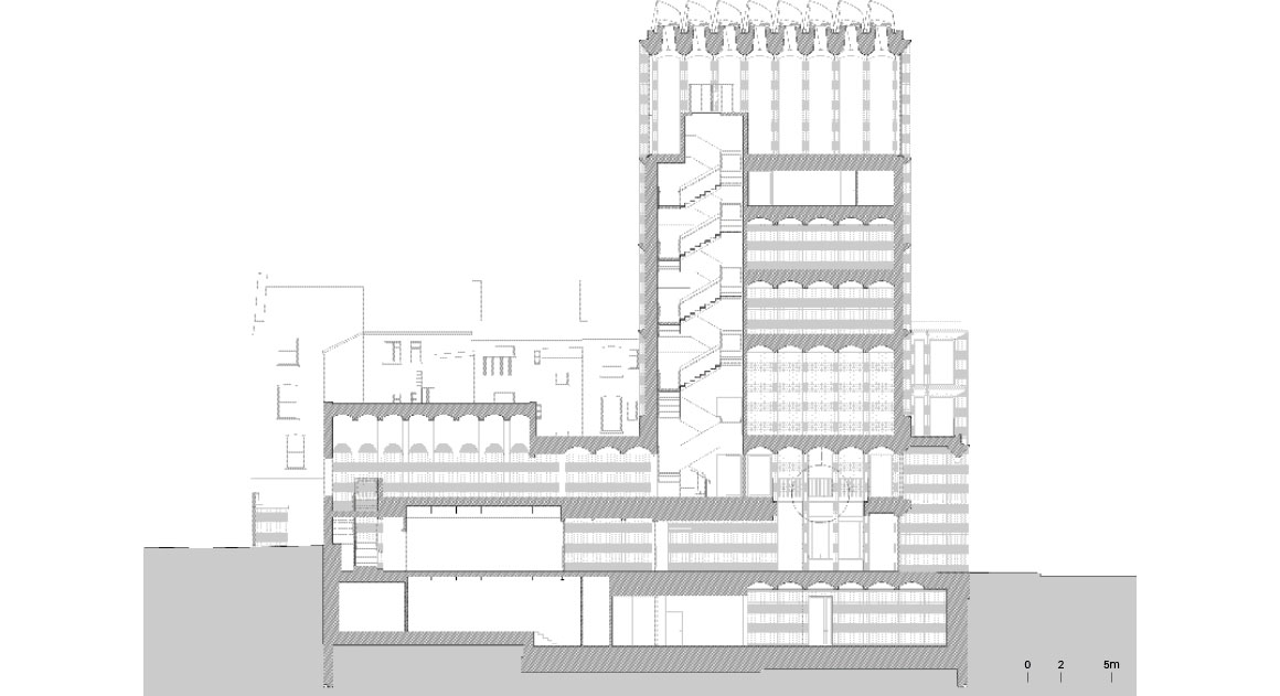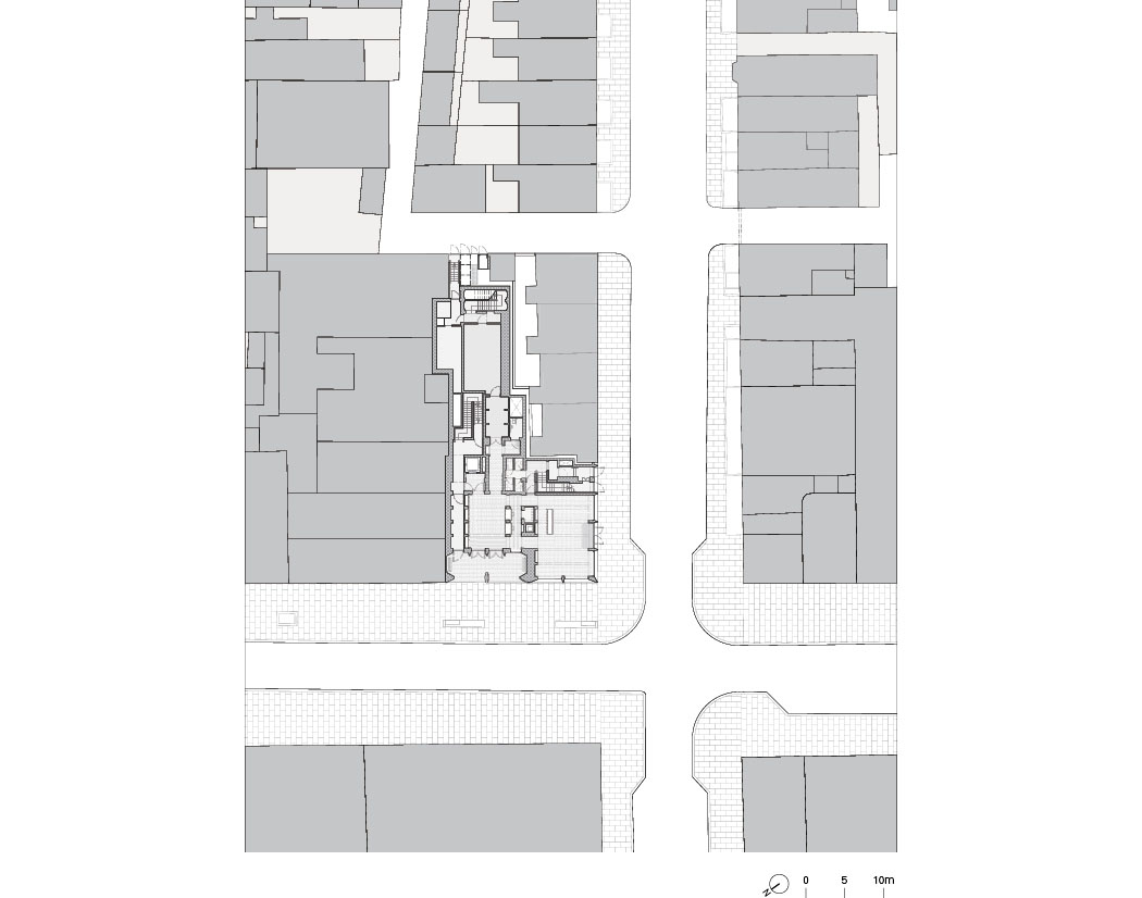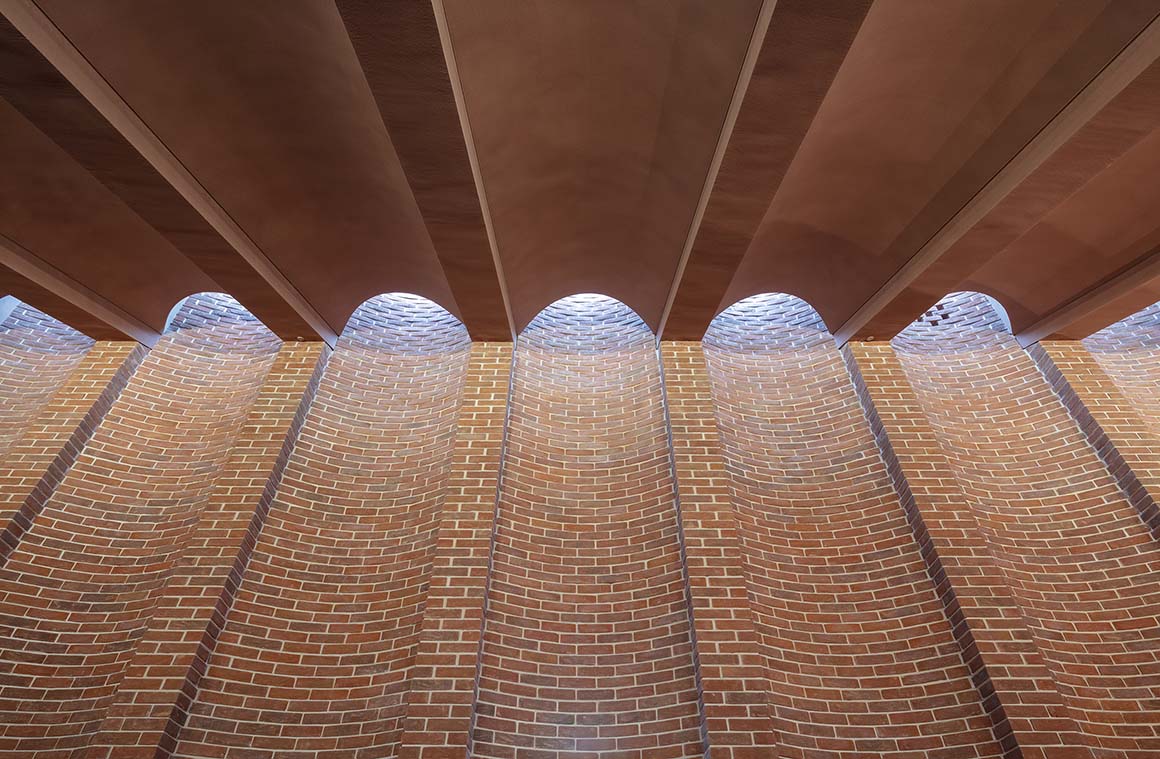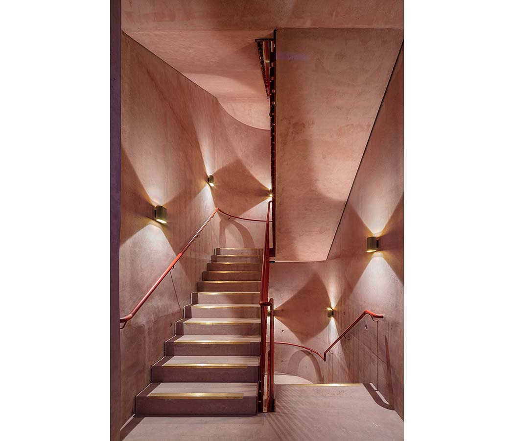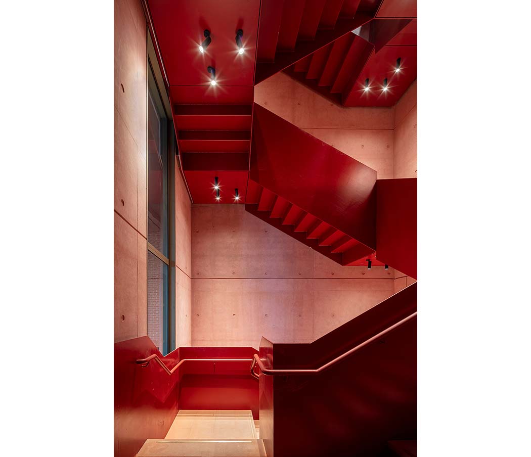 Opening toward the street, the entrance portico provides shade and a place to gather—transforming into a public meeting point for fans on match days. The façade, composed of deep vertical brick piers and horizontal precast concrete elements, expresses the physical dynamics and structural forces of the game itself. These structural rhythms are revealed both inside and out, with the interplay of brick and concrete echoing the movement of the street. Changing light and shadow throughout the day gives the building a living, expressive character.