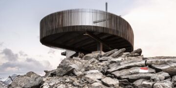 The concept is simple but ingenious and consists of two main elements: Firstly, a framework of wooden beams sourced from indigenous wood as a structurally evident shell, the modules of which are connected by a universal steel connecting element.