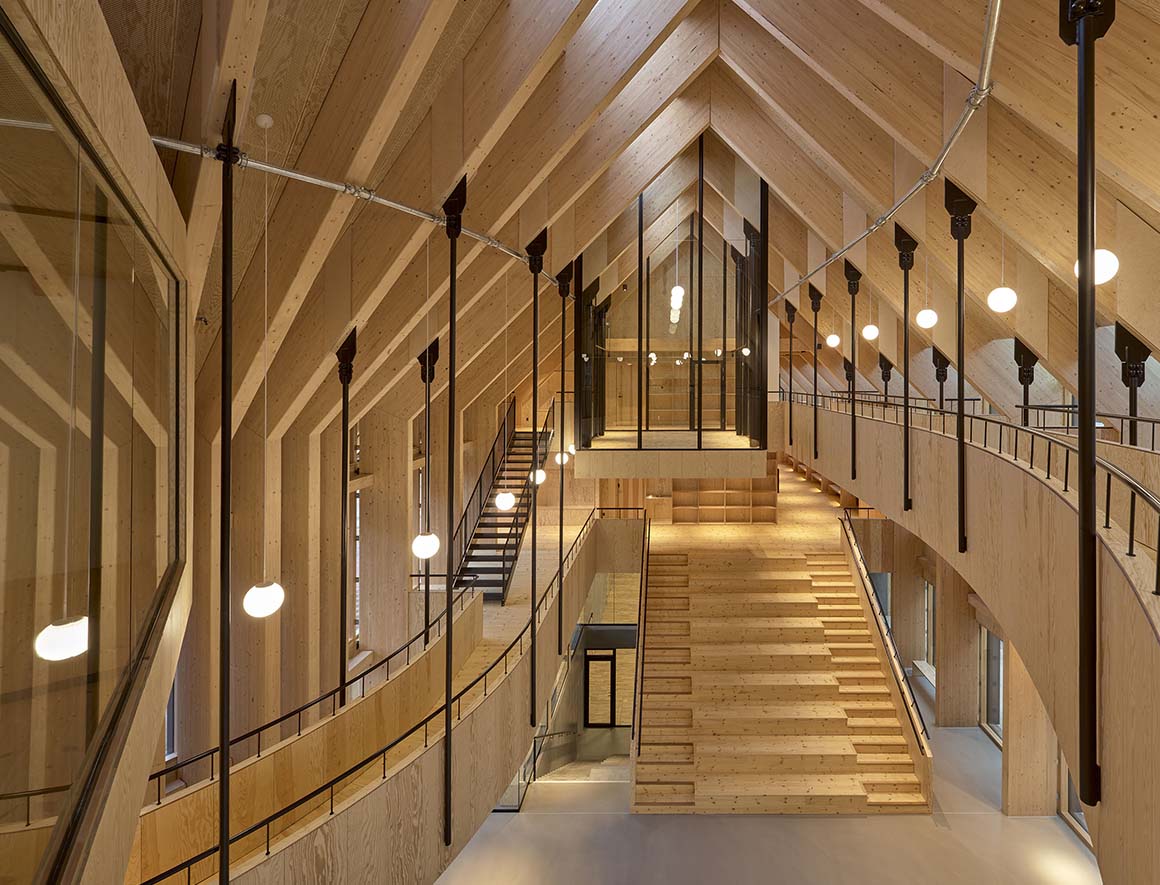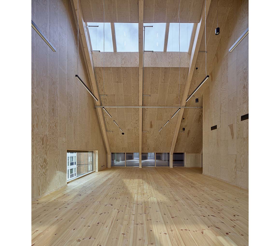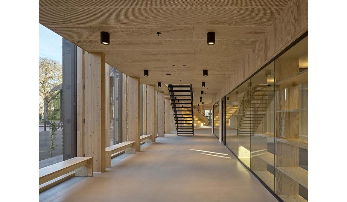 The interior forms a warm and stable atmosphere through exposed timber finishes. Some timber panels provide acoustic control while emphasizing the material’s tactile and environmental qualities. Daylight entering through large windows and roof openings changes over time, continuously altering the spatial character and providing a sustained sensory experience. The exterior is clad in dark brown metal panels that act as a protective layer while connecting the roof and façade into a continuous surface. Photovoltaic panels integrated into the roof produce energy, and the exposed timber structure forms deep louvers that regulate solar gain. On the garden side, a fully glazed façade opens the interior to the surrounding greenery, visually connecting inside and outside while maximizing natural daylight.
