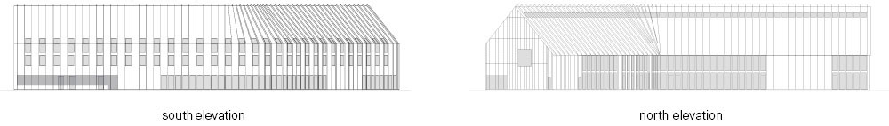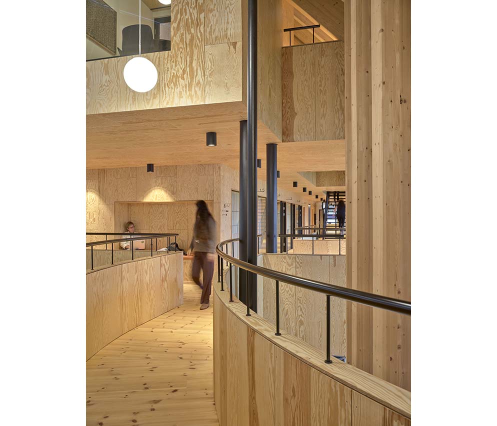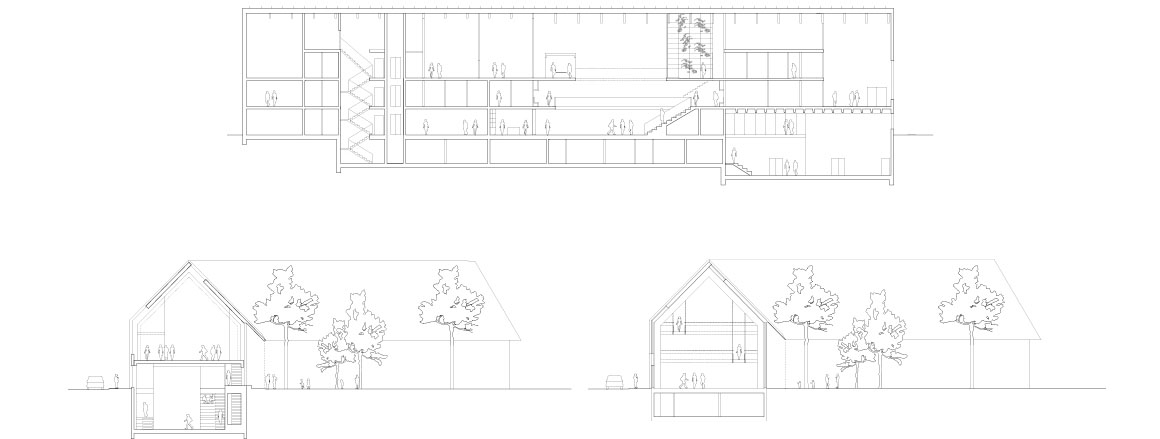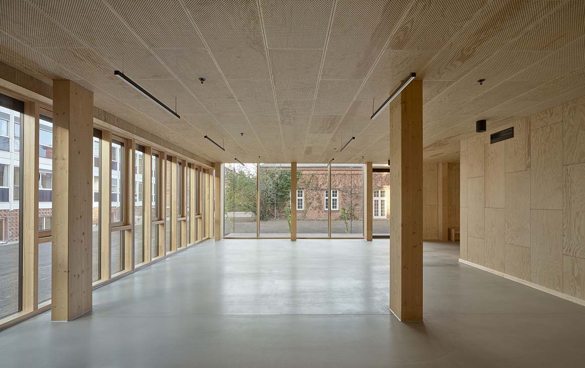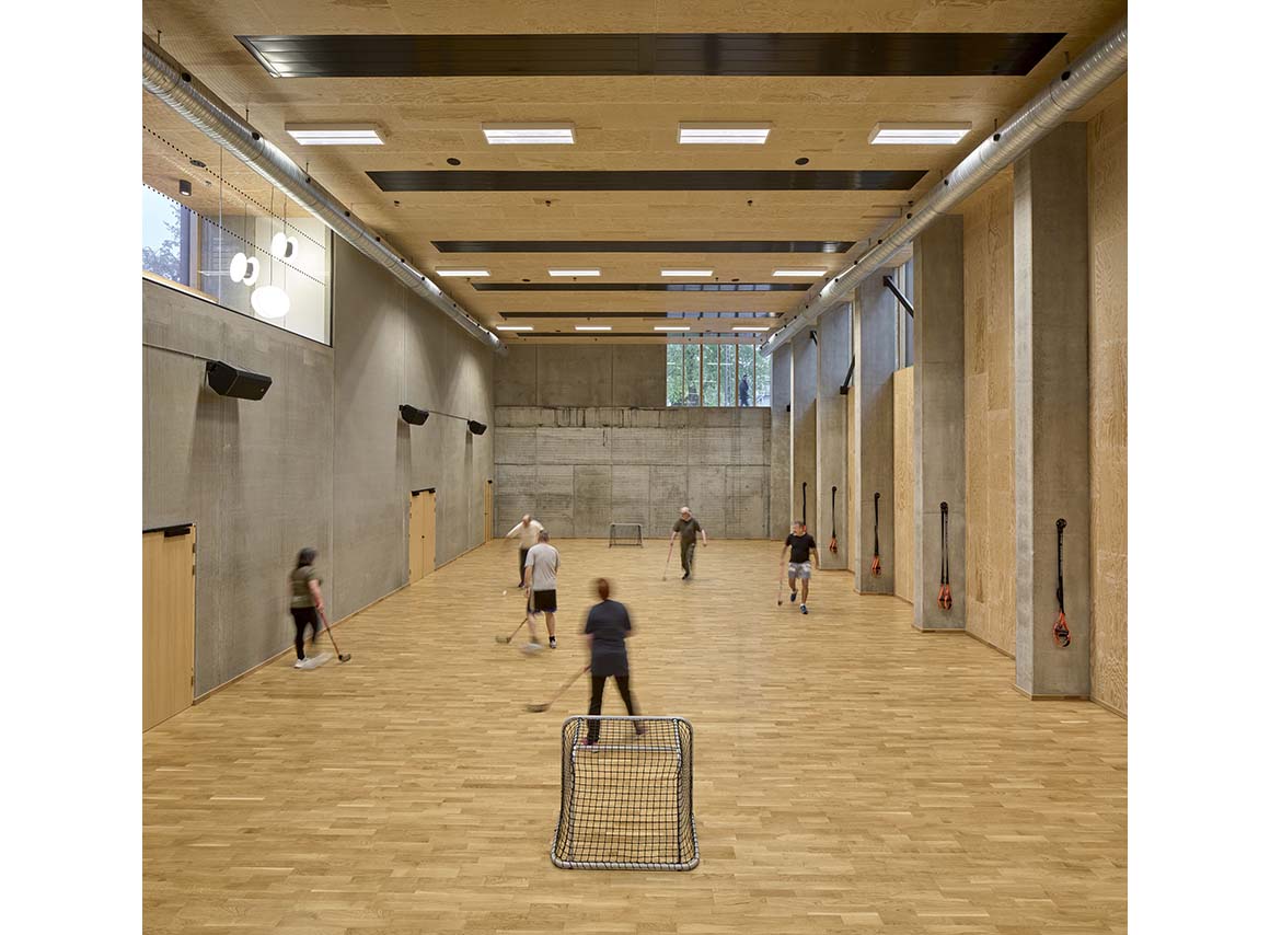 The interior forms a warm and stable atmosphere through exposed timber finishes. Some timber panels provide acoustic control while emphasizing the material’s tactile and environmental qualities. Daylight entering through large windows and roof openings changes over time, continuously altering the spatial character and providing a sustained sensory experience. The exterior is clad in dark brown metal panels that act as a protective layer while connecting the roof and façade into a continuous surface. Photovoltaic panels integrated into the roof produce energy, and the exposed timber structure forms deep louvers that regulate solar gain. On the garden side, a fully glazed façade opens the interior to the surrounding greenery, visually connecting inside and outside while maximizing natural daylight.