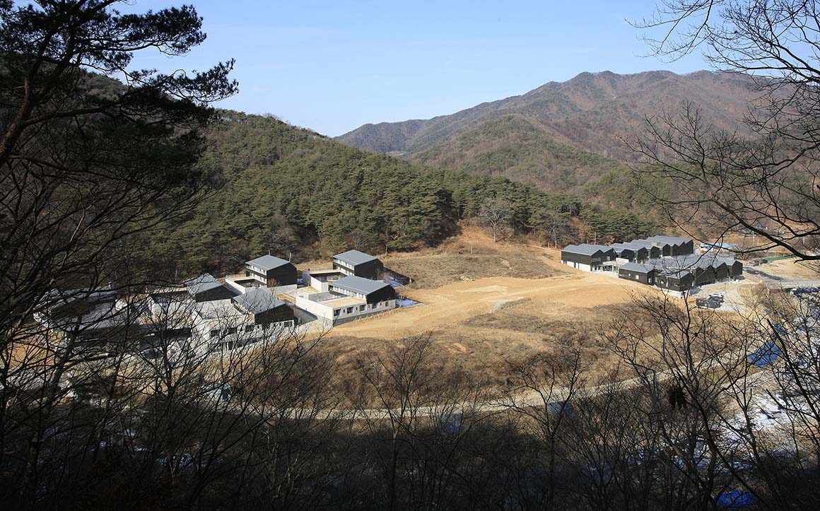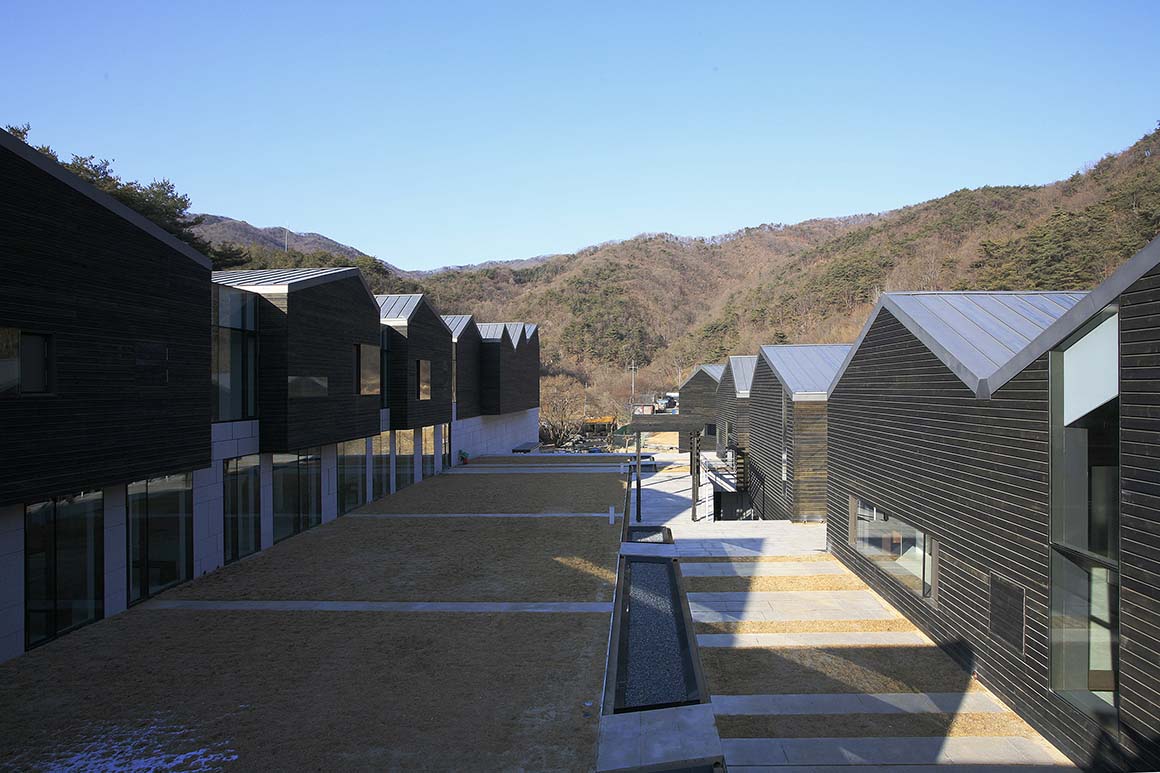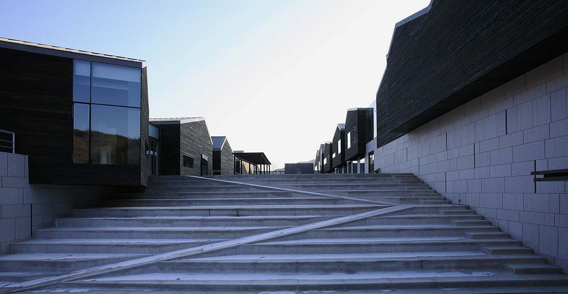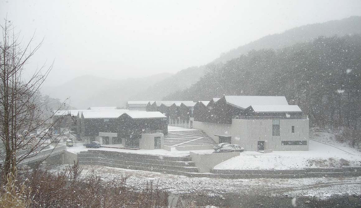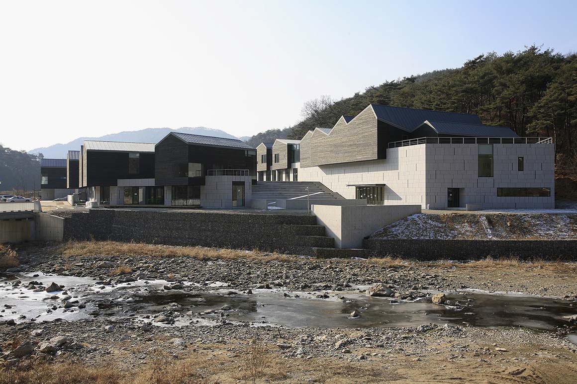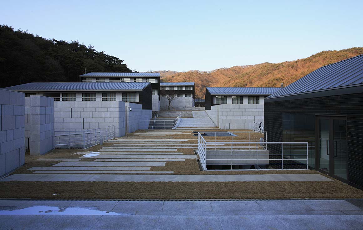 The Magoksa temple neighborhood, situated in Gongju, Chungcheongnam-do, is an area of great historical importance, where numerous tile kilns from the Joseon Dynasty have been unearthed. To protect its cultural value, a significant portion of the region has been designated as a no-build zone. Therefore, the Traditional Buddhism Center of Jogye Order opted to construct buildings on the periphery of the site while leaving a vast open space in the center, creating a visually stunning interplay of voids and structures.