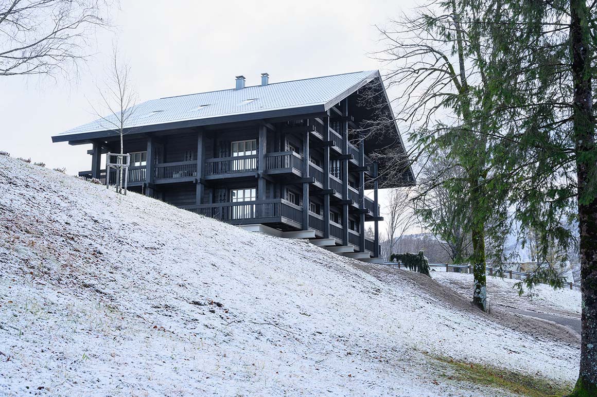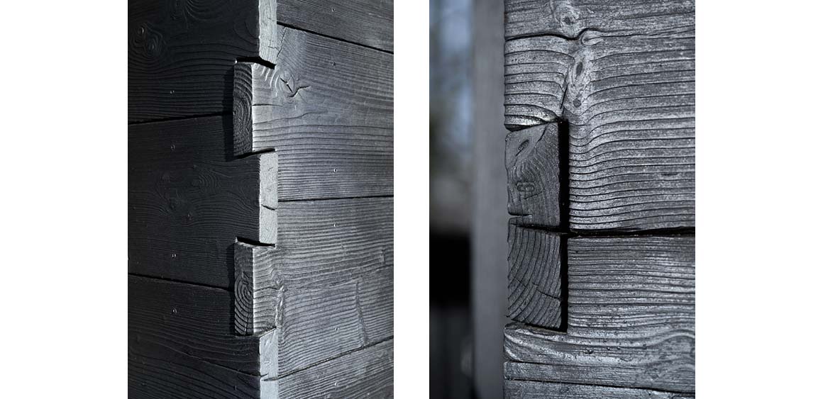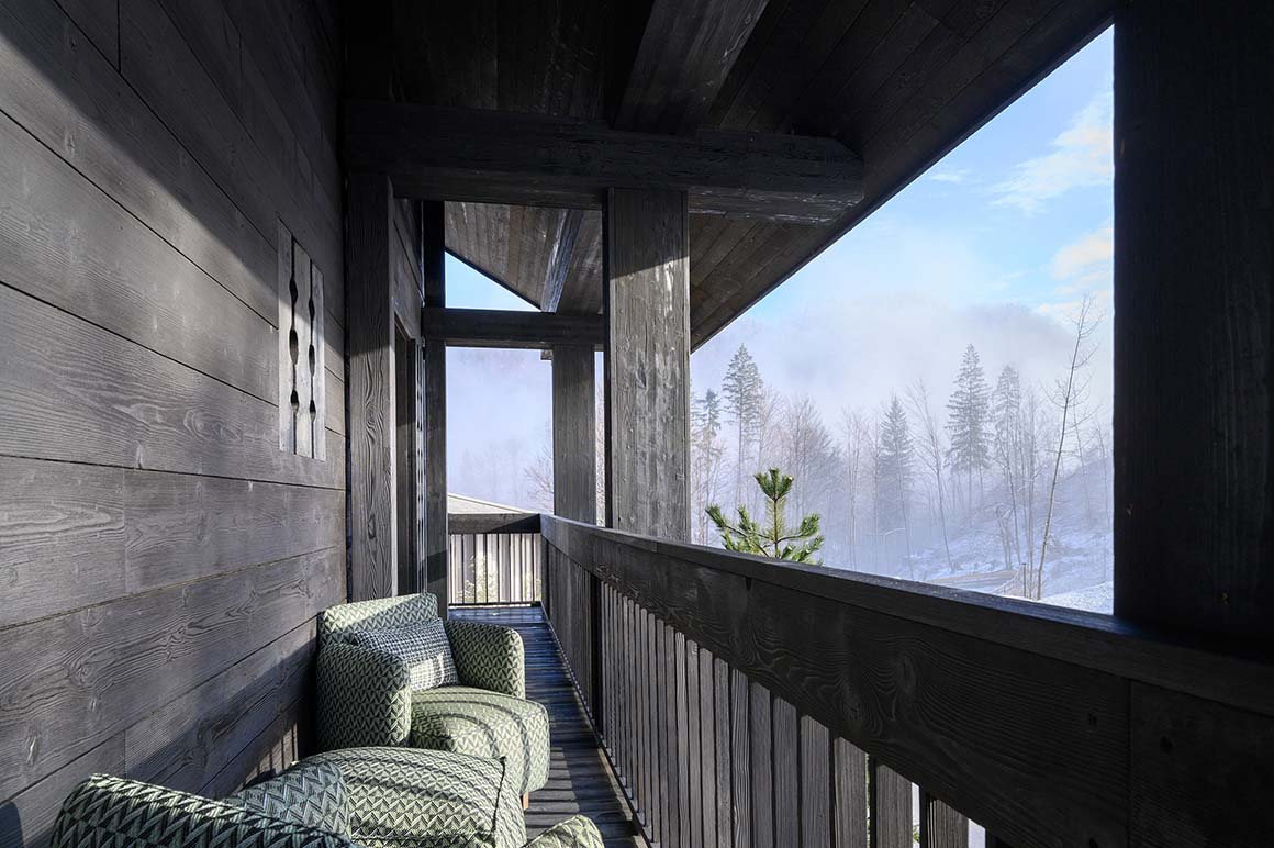 Material choices further reinforce this approach. The lower level is built with reclaimed stone, while the upper volumes are clad in Slovenian timber. Instead of chemical treatments, the wood is finished using a traditional carbonization technique, enhancing durability while preserving its natural character. This method reinterprets local building traditions through a contemporary lens. The original wooden balconies of the villa are likewise reimagined, integrated into the new structure to carry both form and function forward.
