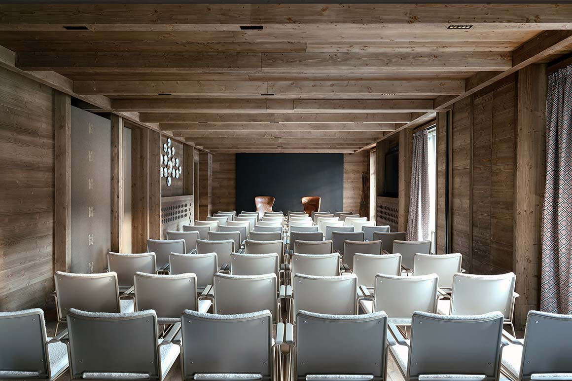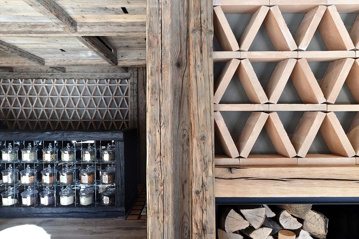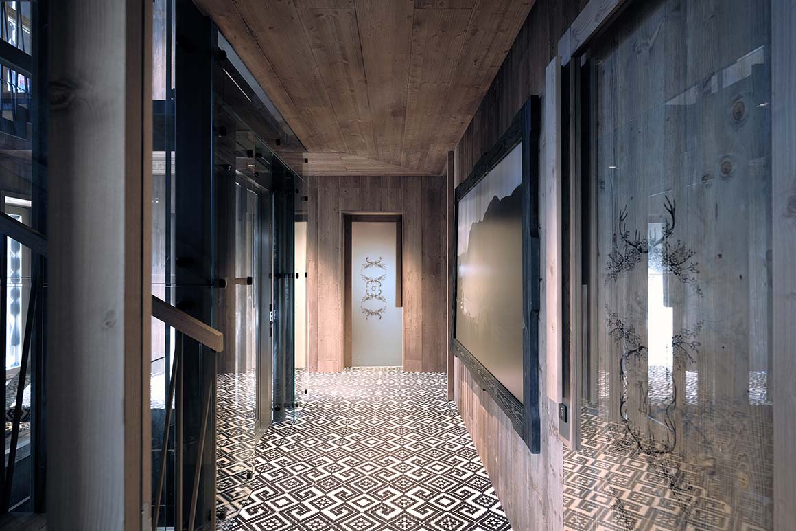 An underground tunnel that once connected the villa to the neighboring hotel has been transformed into an exhibition space. Here, the history of Vila Muhr and the broader context of Bohinj are presented through curated displays. Lighting fixtures crafted from storm-felled trees and decorative patterns inspired by traditional hayrack ornamentation subtly evoke the site’s cultural memory.