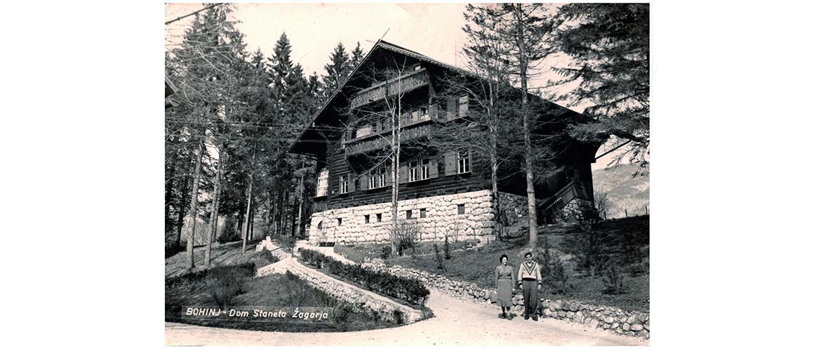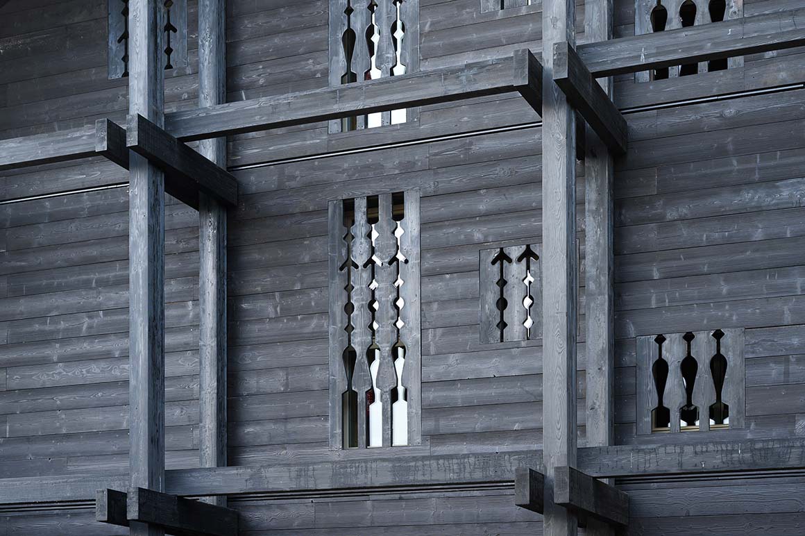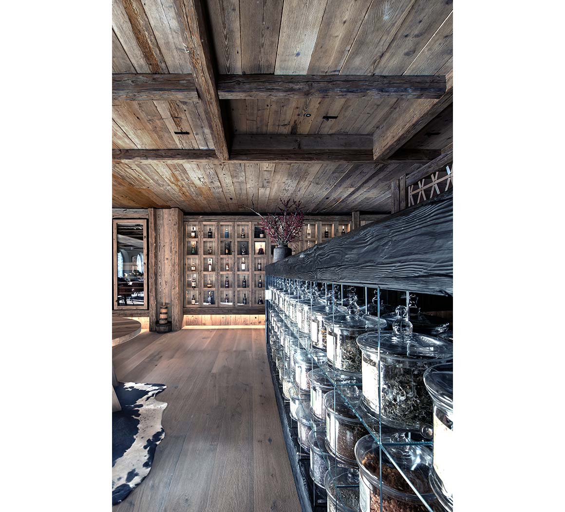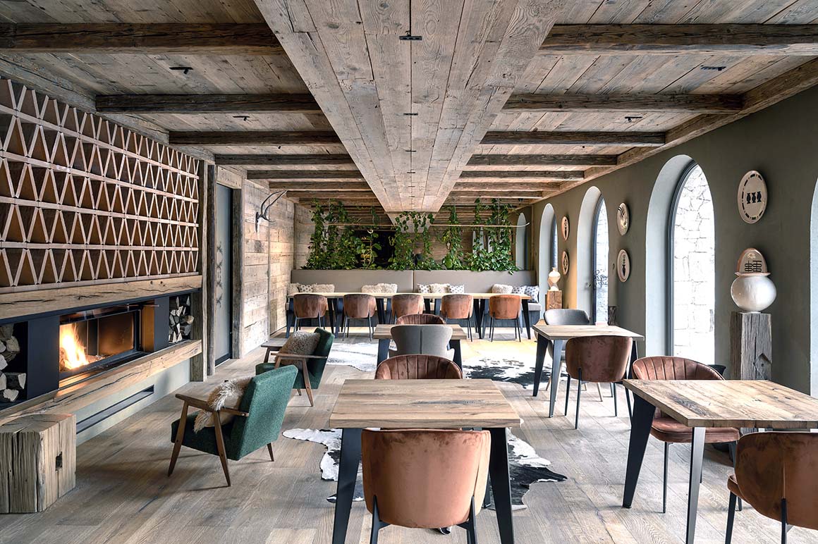 An underground tunnel that once connected the villa to the neighboring hotel has been transformed into an exhibition space. Here, the history of Vila Muhr and the broader context of Bohinj are presented through curated displays. Lighting fixtures crafted from storm-felled trees and decorative patterns inspired by traditional hayrack ornamentation subtly evoke the site’s cultural memory.