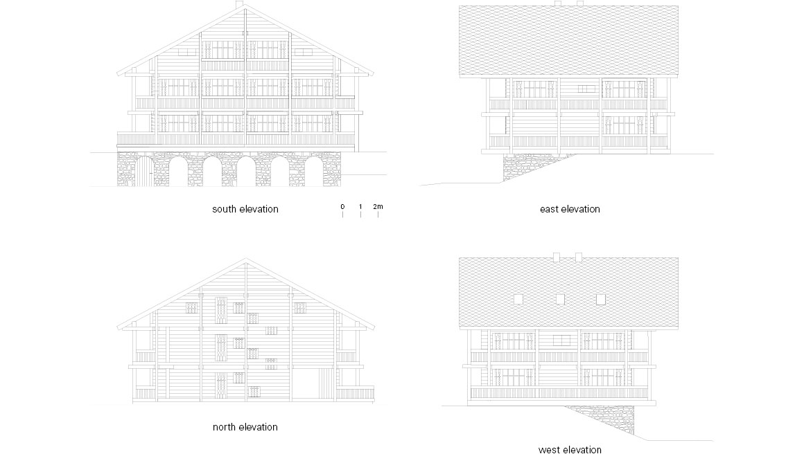 The interior program centers on hospitality and dining. A restaurant on the ground floor incorporates local materials and handcrafted elements, while the second floor houses a multipurpose hall for meetings and events. Above, four guest rooms are arranged as independent suites, each equipped with fireplaces, saunas, and expansive views of the surrounding landscape. Large openings and balconies extend visual connections outward, allowing the interior spaces to open seamlessly toward nature.