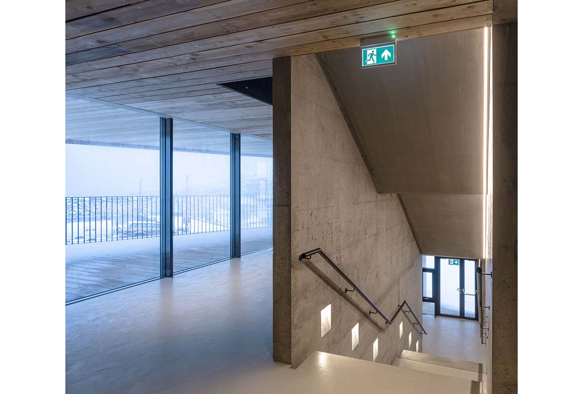 The building totals 345 square meters, and can be entered both from the top and the ground level. The building has a robust character and materiality that accommodates the nature of its different users well and also enables it to be unmanned part of the year. The texture of the building emphasizes its simple nature and humble existence in spectacular surroundings. The in-situ cast concrete is mixed with colorful regional stone aggregates giving a rough and variable texture which changes throughout the day and the seasons. The building is simple in execution, with polished concrete floors and black steel railings, doors and window frames.