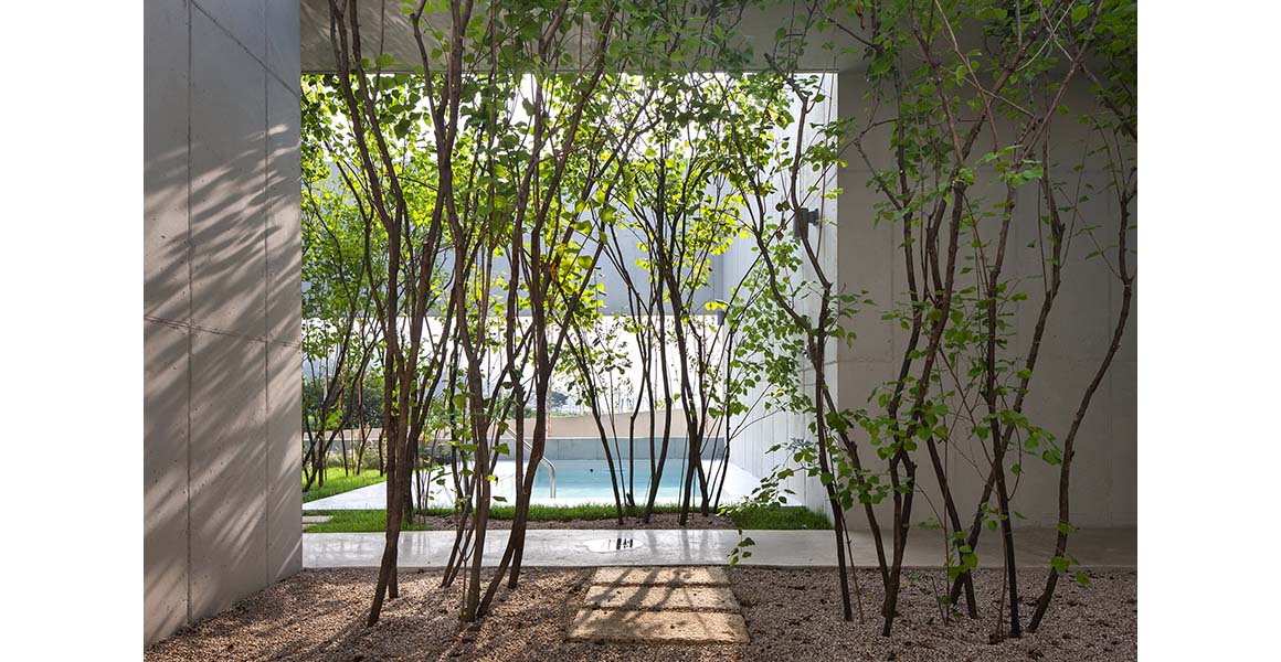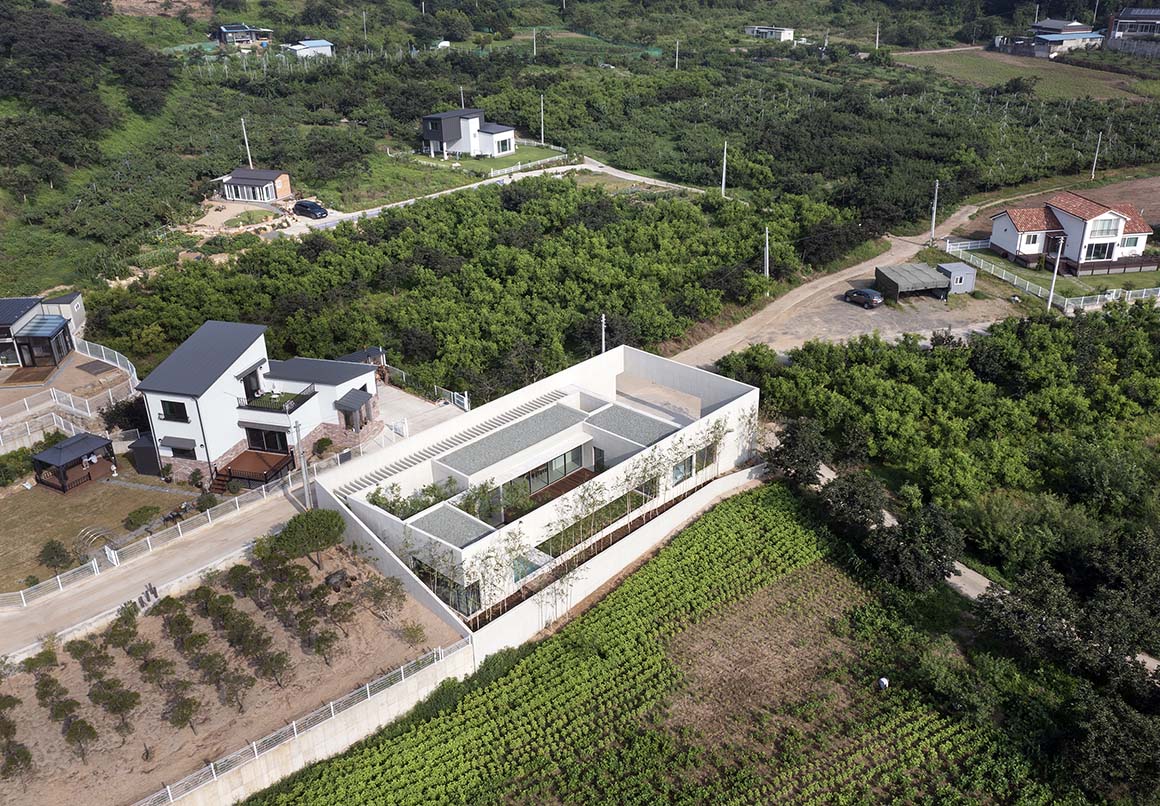 It is a rural village in Cheongdo, Gyeongsangbuk-do, located 30 to 40 minutes by car from Daegu City. It is not a place where you can expect a spectacular scenery that is dramatically overpowering. It is not even a place with stimulating and busy tourist content. It is a typical rural and secluded suburb with peach orchards spread around it. Therefore, the meaning of coming to this place is not a trip or tourism hoping for an unusual experience, but the concept of having rest, comfort, and recovery from a tired and busy daily life. It is for this reason that the concept of ‘another home’ for relaxation is calmly expressed in each space arranged with neat lines and in the scale and height of the space.