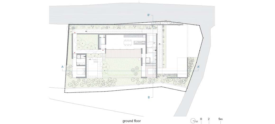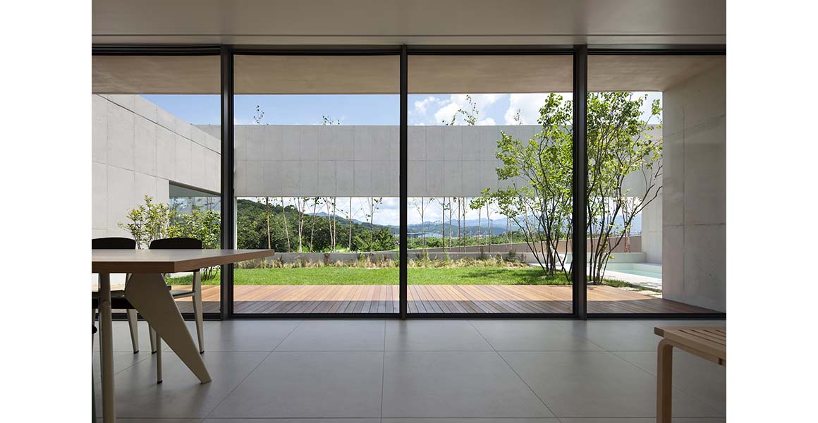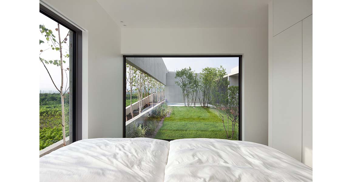 The house is sitting with its back straight along the narrow dirt road that runs through the neighborhood. Even in the season when the greenery is thick or the autumn leaves are disturbed, even in the season when the empty branches feel chilly, you can guess that the house will stand out. It is because the shape of the three-dimensional cuboid and the very light gray concrete exterior are somewhat unfamiliar in the landscape created by the village. Instead, all the scenery inside the house is friendly and welcoming. It is thanks to the fact that the landscape of the surrounding countryside has been removed and it has come close to the frame of the cut-out wall in a natural breathing relationship.