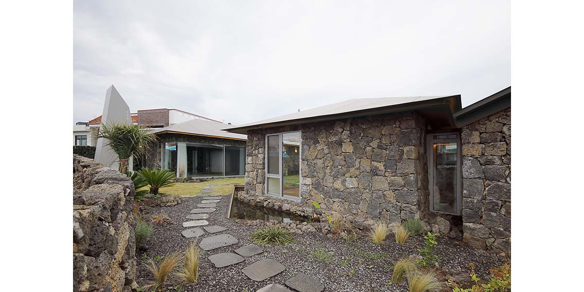 A Jeju stone house has different characteristics from a Hanok on land. The main building, annex buildings, and warehouses are arranged around a courtyard, and all of them are integrated into one property by stone walls. The unique feature of Jeju stone houses is that the building is made of thick and heavy timbers, to counter strong winds, and the outer walls are made of materials that are easily available on the island such as stones, mud and rice straw.