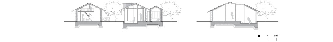 The gates and buildings are left in their original positions, but the exterior spaces are adapted to the new use. The space around the entrance opens up more than before, allowing visitors to see the stone walls extending continuously to the inside of the site. In addition, the eaves have been further pulled outward to form a better proportionality with the increased height of the walls, and the roof has a neat pattern that reveals the unique tactile sensibility of the stone house in contrast with the ragged stone wall.