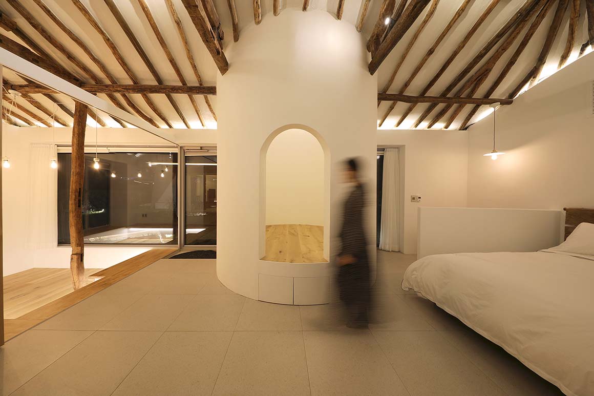 The key was to redefine the area by new standards while maintaining the physical structure of the existing house. The two buildings, initially one for the parents’ home and the other for children’s home, has been divided by the nature of the space into public and private. According to the concept of the existing house, one building has a common space such as a living room and a kitchen, and the other building has a private space such as a bedroom and a spa. Internally, only the wooden structure was left, and all the walls were demolished, transforming the blocked-off and segmented house into an open and expanded space, suitable for the new accommodation.