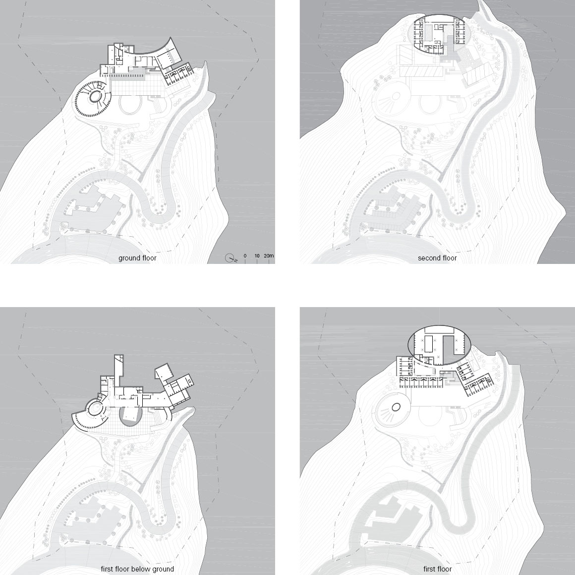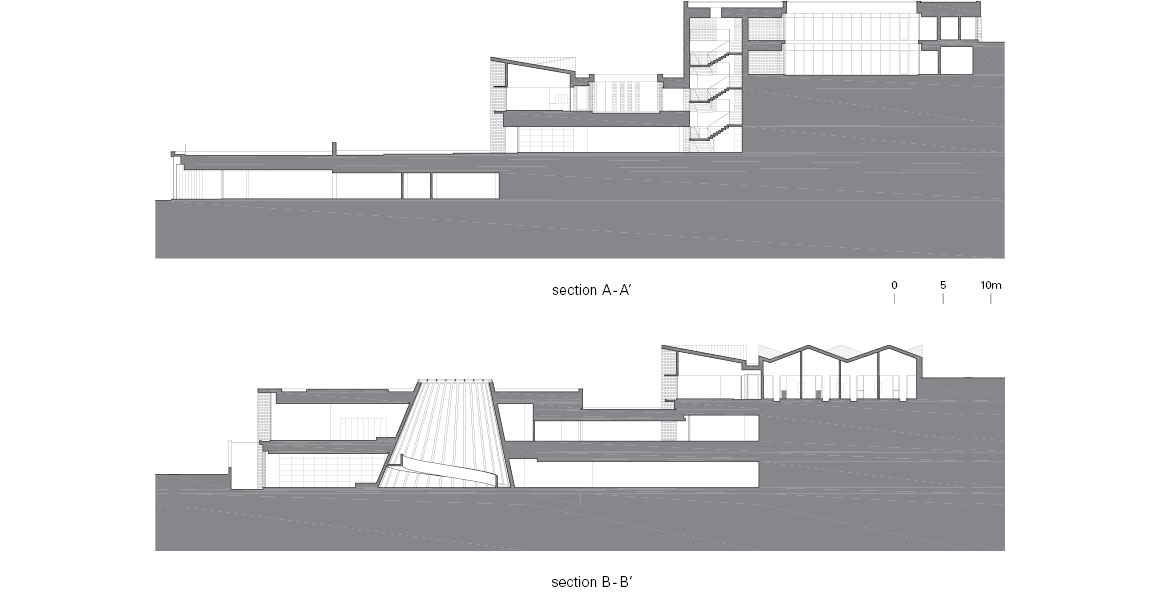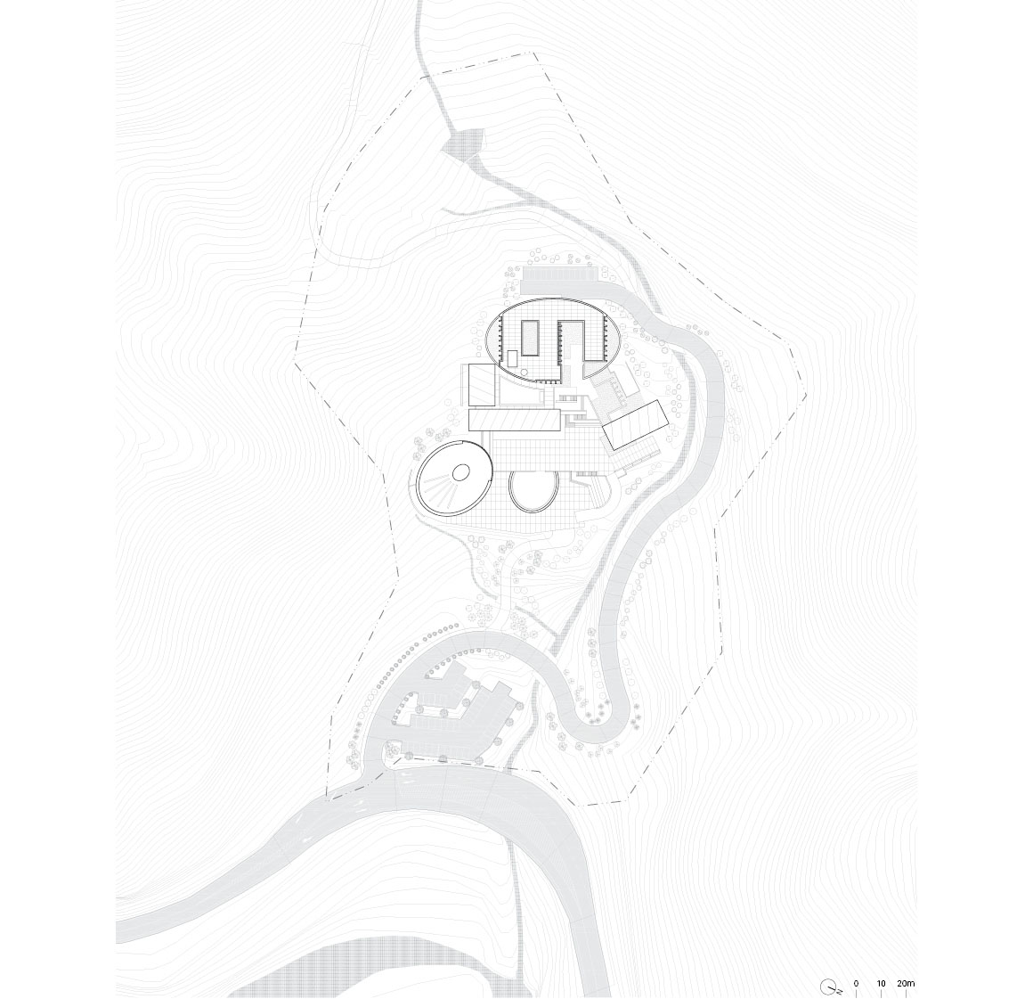 The site was reshaped into multiple terraces, each linked by dual circulation routes of stairs and ramps. These not only meet functional needs but also enrich the pedestrian‘s spatial experience. Large volumes are embedded in the earth, while above ground, the masses are fragmented and dispersed to blend with the mountain. Their rooftops are reclaimed as courtyards.