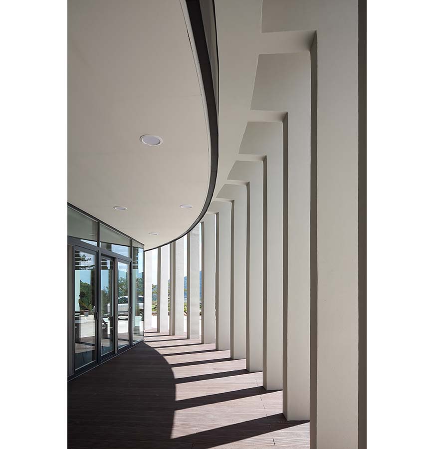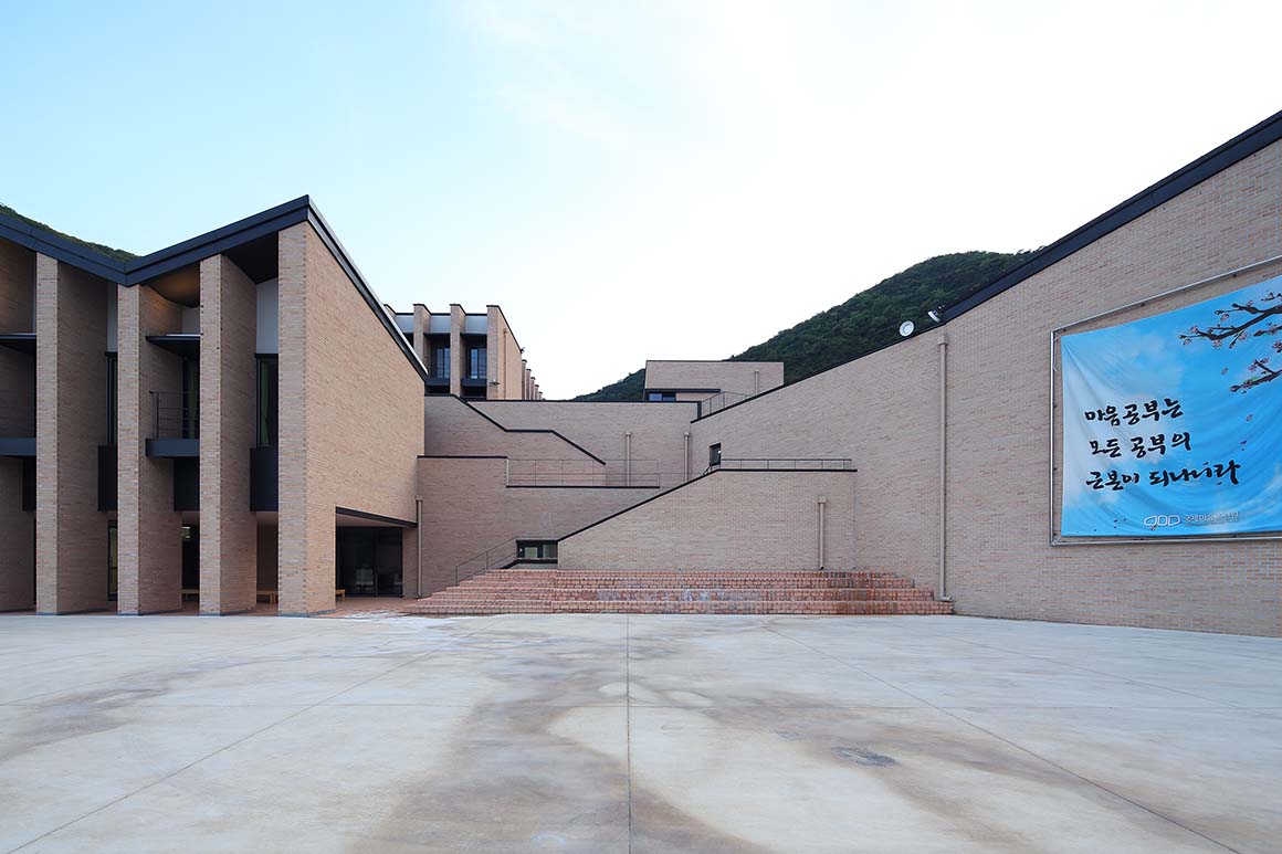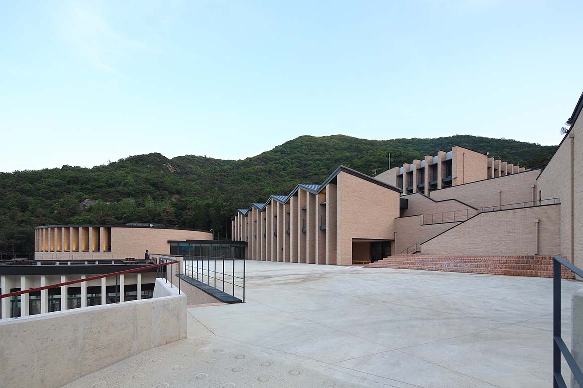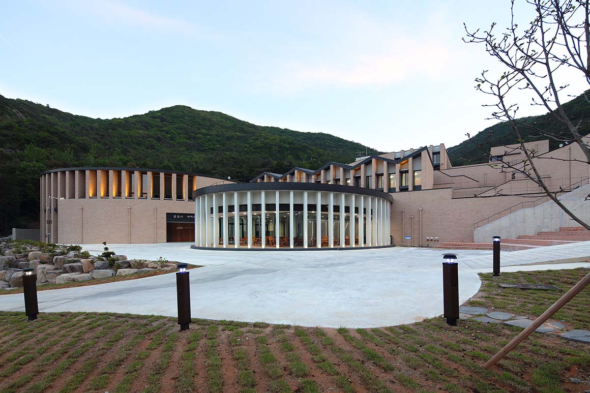 At the heart lies an open courtyard. The education hall, ritual spaces, and twin dormitories encircle and order this void. The lowest forecourt, enclosed by the education hall and dining facilities, contains a refectory whose square interior is encased in a circular wall. Between them, a terrace with colonnades draws the mountain landscape in like a painted screen. Ascending to the main courtyard, one finds it encircled by brick colonnades and an oval wall, yet open toward the Beopseongpo estuary. From the circular rooftop terrace of the dining hall, panoramic views unfold beyond restrained architectural devices.