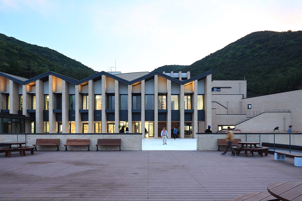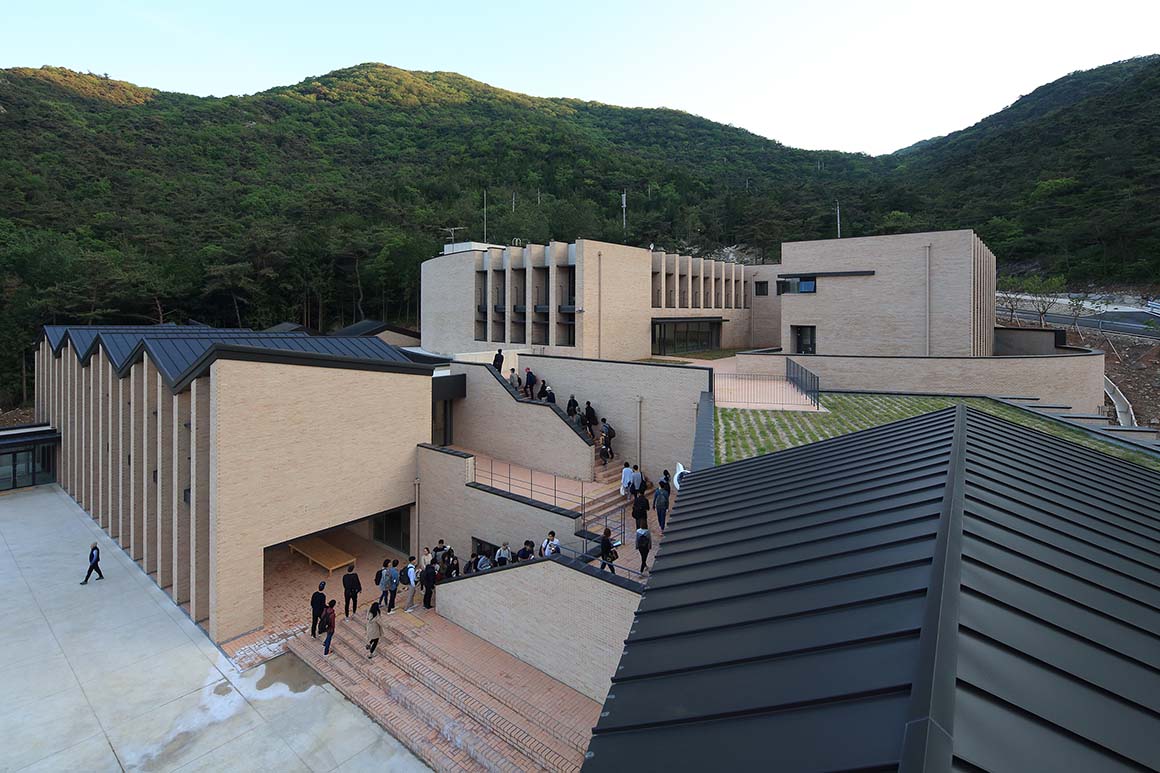 Project: WON International Retreat Center / Location: 1840, Haean-ro, Gusu-ri, Baeksu-eup, Yeonggwang-gun, Jeollanam-do, Republic of Korea / Architects: Kim Seunghoy (SNU) + Kang Wonphil (KYWC Architects) / Project team: Jang Soojung, Kim Jungyun, Kim Hyunjun / Structural engineer: Yun Koojo Structural Engineering Co. / Mechanical and electrical engineer: Buyun Engineering Co., Ltd / Contractor: Hae-Pyeong Construction Co., Ltd. / Client: WON International Retreat Center / Use: educational research facility / Site area: 39,800.00m² / Bldg. area: 2,989.35m² / Gross floor area: 6,679.17m² / Bldg. coverage ratio: 13.39% / Gross floor ratio: 21.02% / Bldg. scale: one story below ground, four stories above ground / Height: 13m / Structure: R.C + steelframe structure / Exterior finishing: brick, exposed concrete, galvalume / Interior finishing: birch plywood, laminated wood floor / Design: 2012.12.-2013.8. / Construction: 2013.12.-2016.2. / Completion: 2016 / Photograph: ©Kim JaeKyeong (courtesy of the architect)
