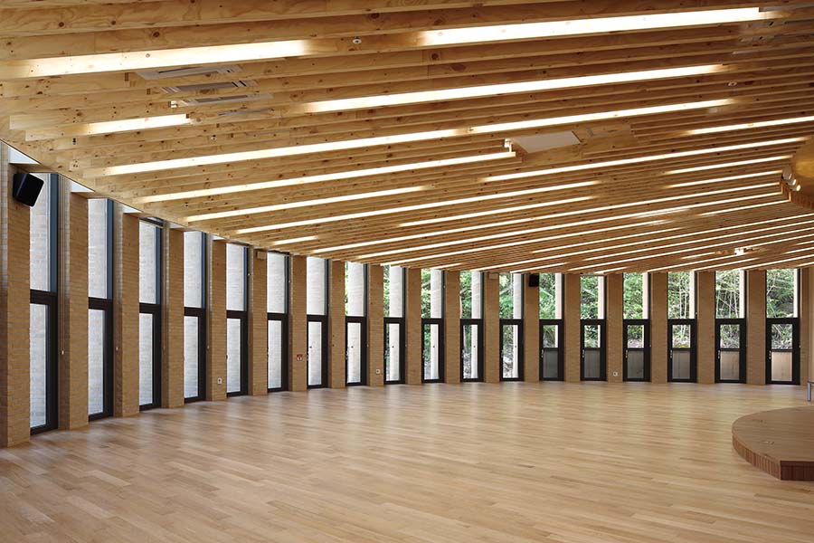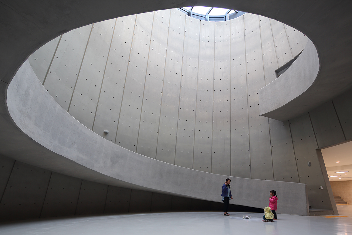 The ritual hall centers on a two-story oval void illuminated from above, filling the space with daylight. At its center stands a symbolic flame connecting the light of heaven and the light of the mind. A sloping passage rising from underground to the hall suggests the process of spiritual training, culminating in the meditation hall. Its fan-shaped plan gathers communal energy inward while opening individual meditation outward—an architectural expression of the intersection between ideal and practice.