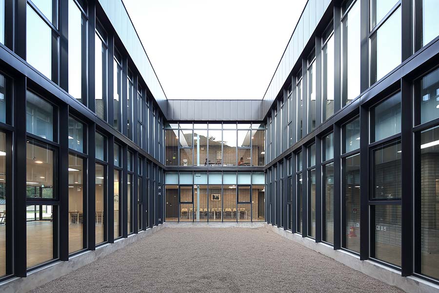Accommodations are divided into a communal training wing and a professional training wing. Cloister-like corridors and open courtyards offer settings for reflection, balancing communal living with private retreat. Guest rooms open to terraces facing the landscape, while the meditation hall provides individual balconies, allowing solitary contemplation. This spatially embodies the belief that the completion of training arises from an inner journey.