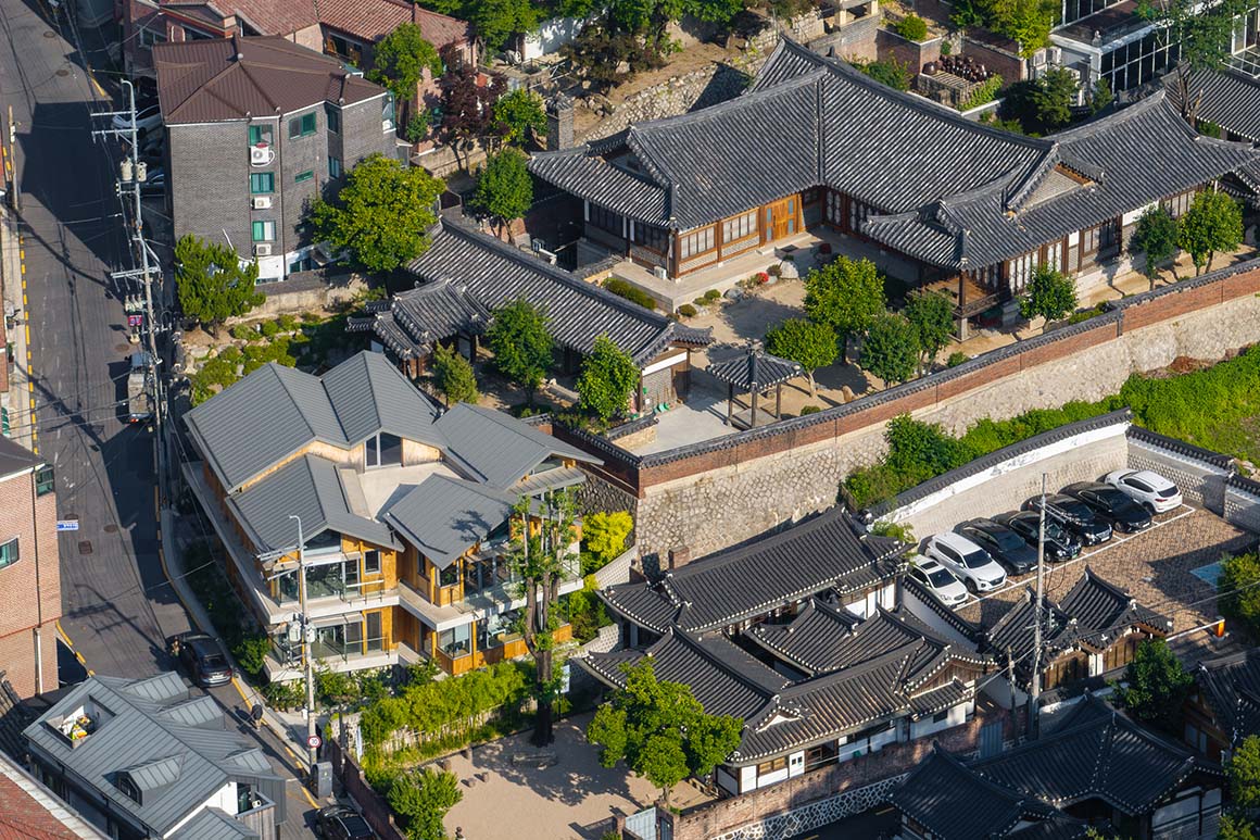 The windows, designed with both functionality and visual appeal in mind, reinterpret the traditional concept of “white space” in a modern context. With varied sizes and proportions, the windows regulate light and create a rhythmic flow throughout the space. The ridge lines and eaves align harmoniously with windows of different heights, embodying the architect’s intention to integrate with the surroundings. The three large windows facing east are particularly notable, framing views of the nearby Goheedong House and Biwon, visually linking the interior with the external Hanok landscape.