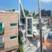 An urban oasis with a metal bridge connecting the garden