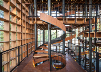 At the top, the bridge takes visitors into the upper floor of the building, where an open terrace with seating and an indoor dining space are located. Inside, the restaurant takes on a much softer character, where the use of natural wood and light hues create a warm, welcoming atmosphere. The contrast between the two zones – interior and exterior – which is enhanced by the material selection, offers a new experience for diners at the restaurant.