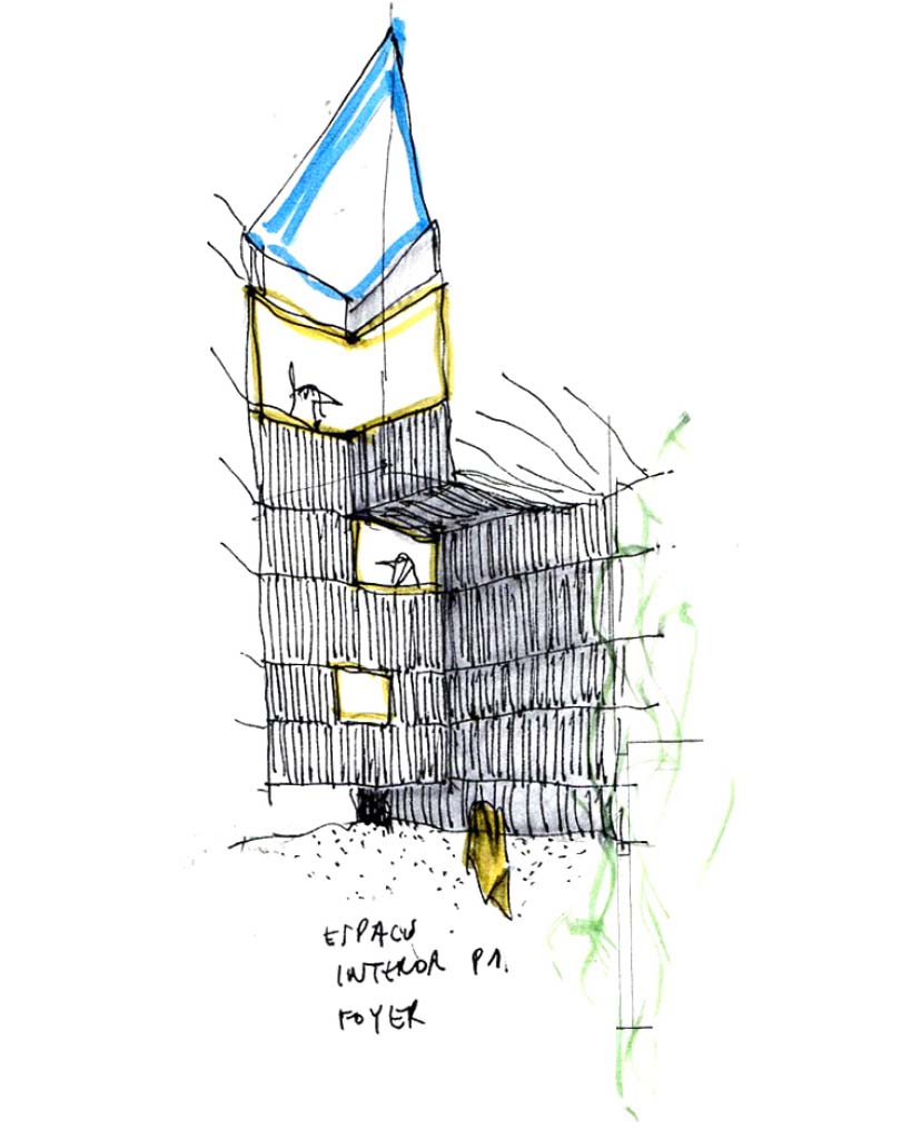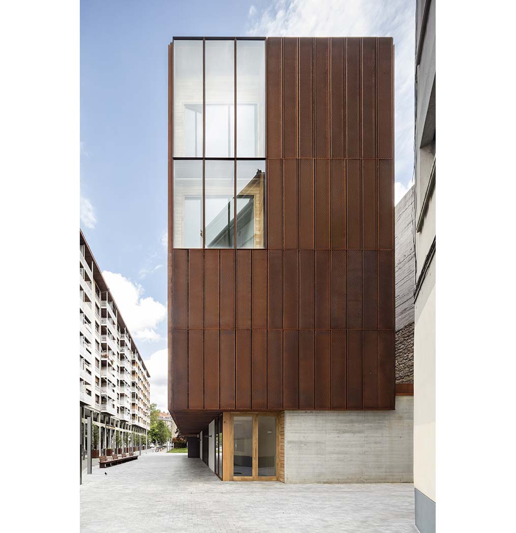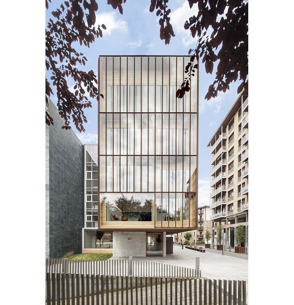 In Amorebieta-Etxano, a Basque town in Spain, a musical school occupies a long thin, four-story box which floats above a recessed ground floor. It extends from an adjacent cultural center, the Zeleieta Center, which it is adjoined to by a ground (first) floor wall at one end and a central vertical circulation shaft.