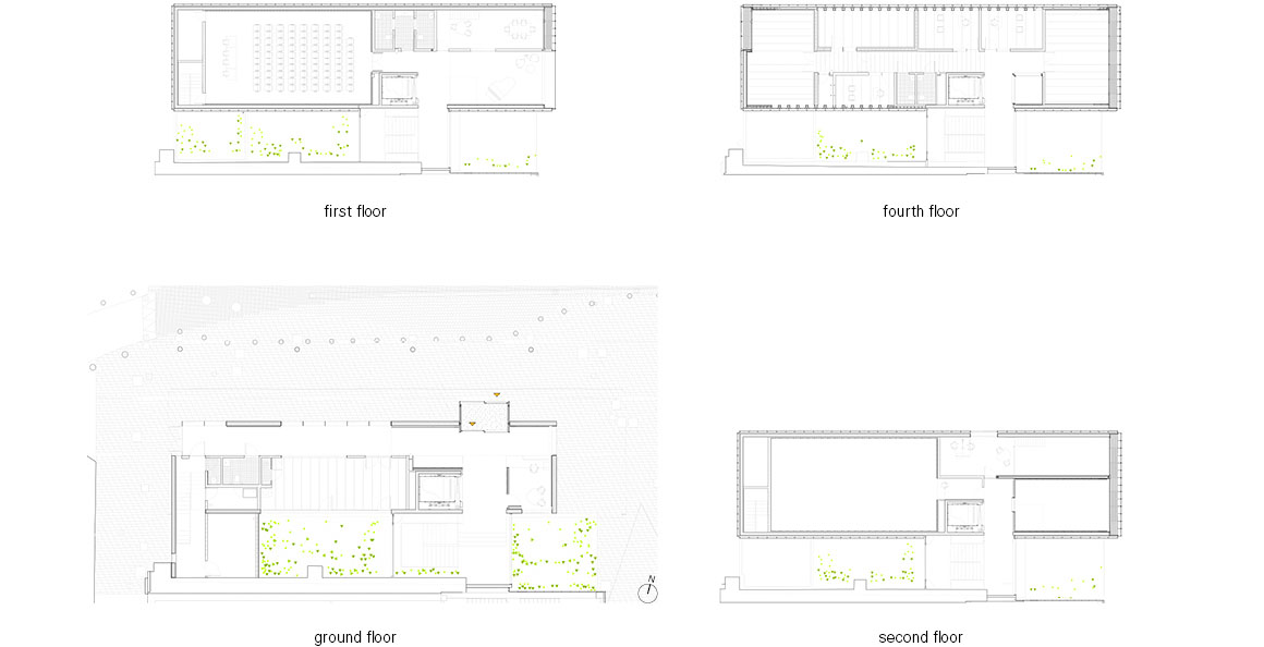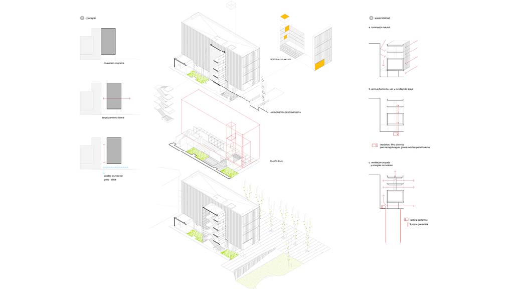 The ground floor closes around a patio that will work as a drainage element and water tank in case of a flood. It is given an offset from the longitudinal facade to create a porch all across the floor and emphasise the access. The top floors resolve the program forming a regular prism three floors high, parallel to the new facade and gap, and a corbel. The second floor, the lowest in the floating box volume, has a double-height auditorium. The two top floors are divided into various rooms. The floors are compact, to achieve an optimization in the available area and an effective, useful and compact box.