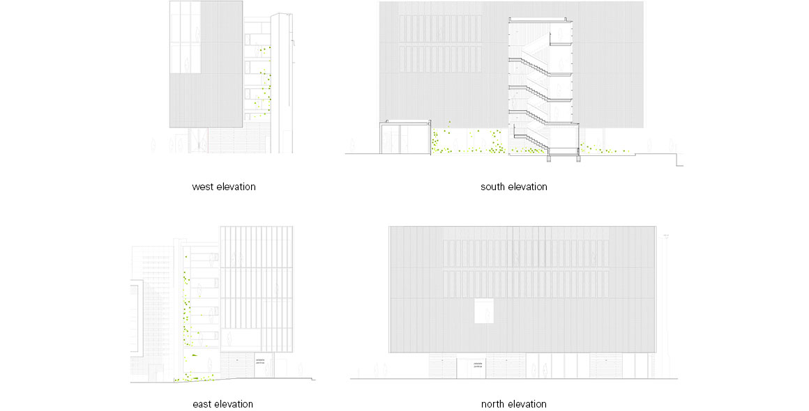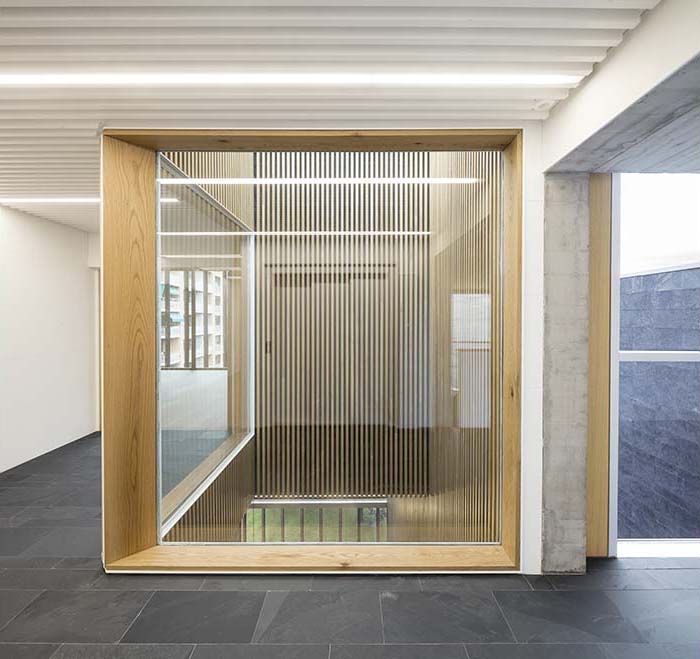 The structure is resolved in the perimeter, with the facades becoming load baring walls. The staircase shaft outside of the box volume is glazed for greater transparency. They become an architectonic experience so that the user can have a view of the park and understand the patio dimensions and the building character as an abstract and singular space.